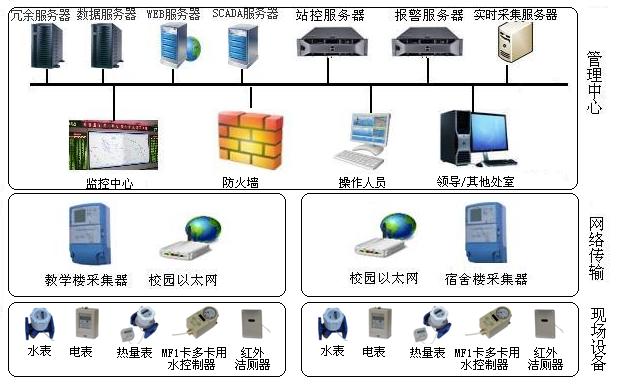 系統(tǒng)概述 基于物聯(lián)網(wǎng)、大數(shù)據(jù)、云計(jì)算及移動(dòng)互聯(lián)網(wǎng)等新興技術(shù)的快速發(fā)展和不斷融合,新天科技順應(yīng)市場潮流,在自身現(xiàn)有的技術(shù)基礎(chǔ)上,開拓性地開發(fā)推出針對(duì)校園中電量消耗、燃料消耗、熱量消耗、冷量消耗及水資源消耗的數(shù)據(jù)采集、傳輸及統(tǒng)計(jì)分析的智慧校園節(jié)能監(jiān)管系統(tǒng)。該系統(tǒng)使學(xué)校能夠有效建立節(jié)能工作的長久機(jī)制,推進(jìn)和深化節(jié)約型校園的建設(shè),實(shí)現(xiàn)校園建筑設(shè)施能源高效利用和管理系統(tǒng)的建設(shè)。 智慧校園節(jié)能監(jiān)管系統(tǒng)由計(jì)量表具、數(shù)據(jù)采集及轉(zhuǎn)換裝置、數(shù)據(jù)傳輸網(wǎng)絡(luò)、數(shù)據(jù)中轉(zhuǎn)站、數(shù)據(jù)服務(wù)器、管理軟件組成。該系統(tǒng)主要用于對(duì)學(xué)校建筑能耗進(jìn)行分類分項(xiàng)計(jì)量、數(shù)據(jù)統(tǒng)計(jì)、數(shù)據(jù)分析、節(jié)能分析及節(jié)能指標(biāo)管理。系統(tǒng)具備能耗數(shù)據(jù)實(shí)時(shí)采集和通訊、遠(yuǎn)程傳輸、自動(dòng)分類統(tǒng)計(jì)、數(shù)據(jù)分析、指標(biāo)比對(duì)、圖表顯示、報(bào)表管理、數(shù)據(jù)儲(chǔ)存、故障自動(dòng)上傳等功能,為校園節(jié)能建設(shè)提供管理依據(jù)。